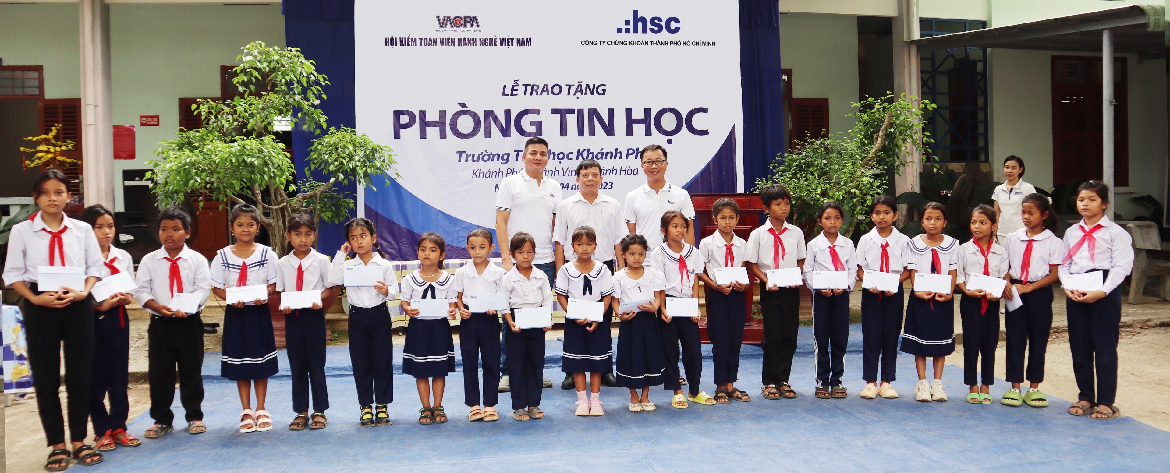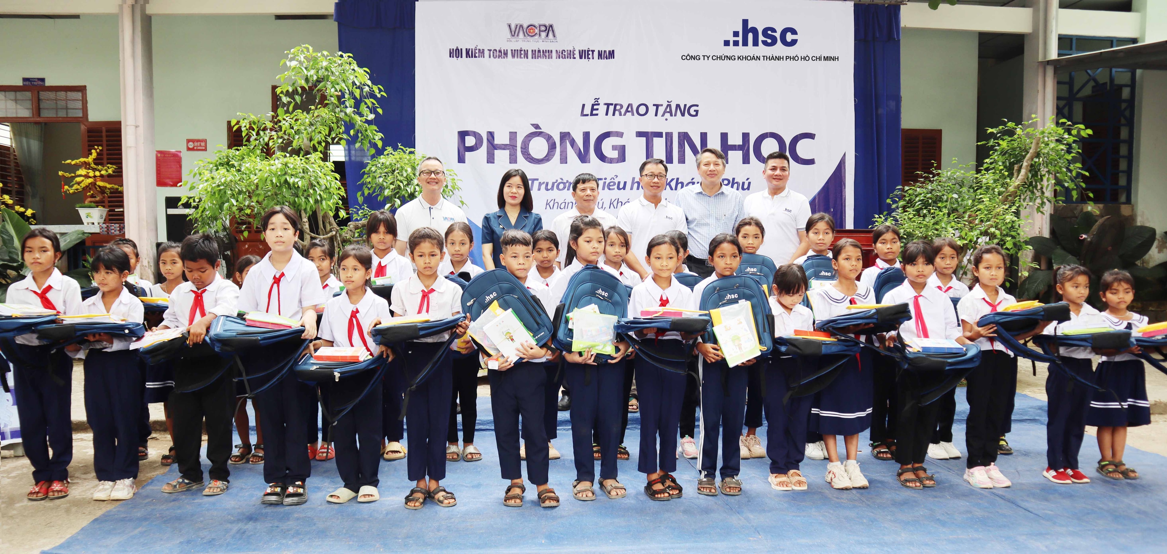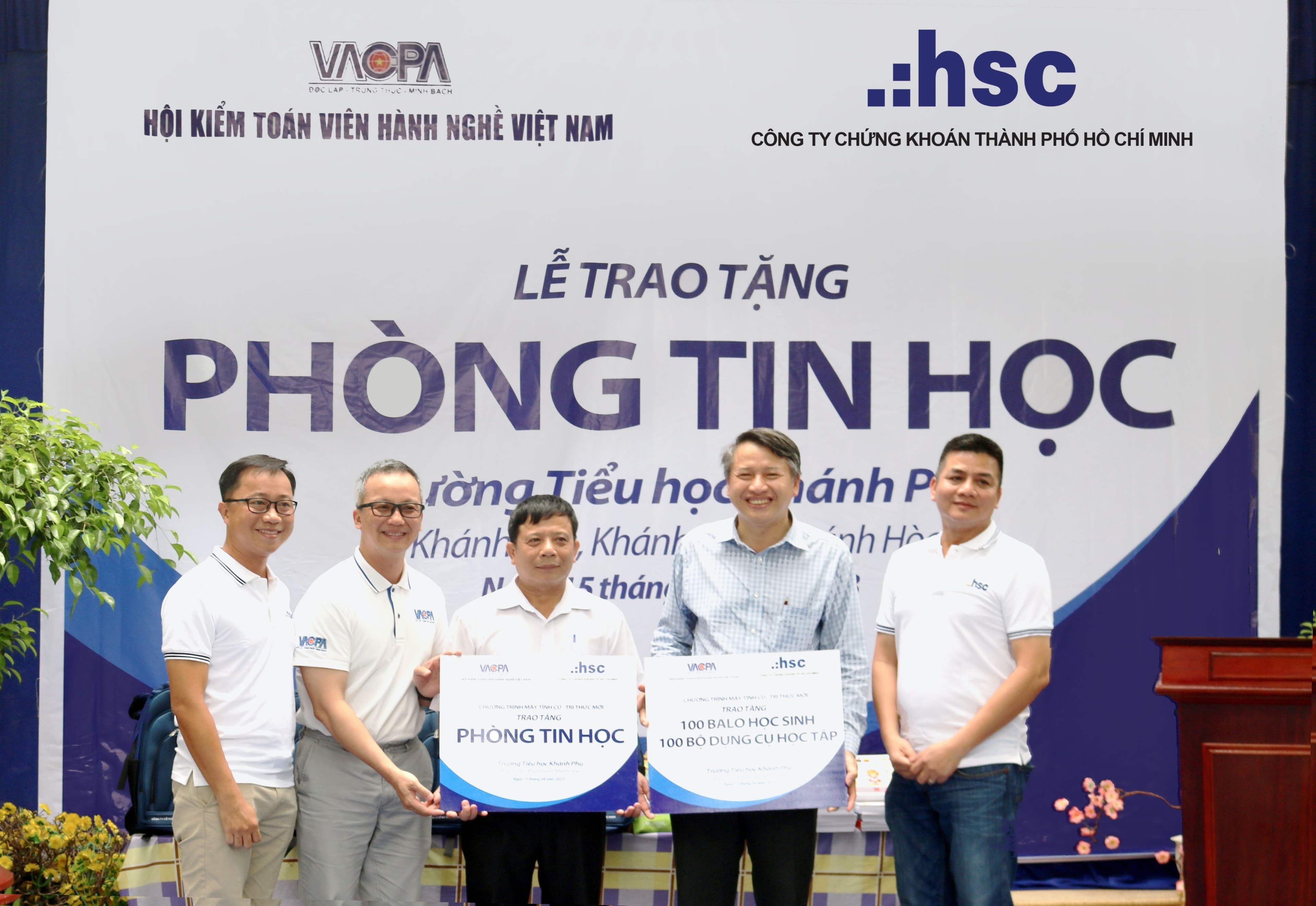 15 bộ máy tính đã qua sử dụng, 100 balo kèm dụng cụ học tập đã được HSC phối hợp cùng cùng Hiệp hội kiểm toán hành nghề Việt Nam (VACPA) trao tặng đến thầy và trò trường Tiểu học Khánh Phú, huyện Khánh Vĩnh, tỉnh Khánh Hòa. Bên cạnh đó, 20 phần quà khuyến học cũng được trao đến các em học sinh có hoàn cảnh khó khăn được quyên góp bởi cá nhân các lãnh đạo HSC.