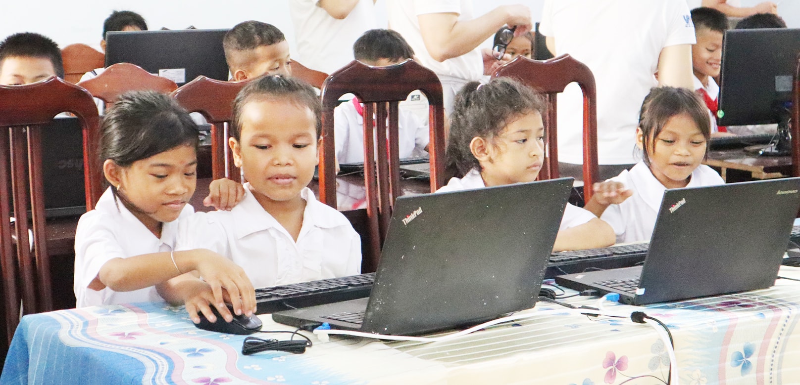 Các em học sinh trải nghiệm sử dụng máy tính đã được lắp đặt hoàn thiện.