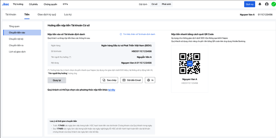 Bước 1: Trên ứng dụng http://One.hsc.com.vn, tại mục dịch vụ chọn chức năng Chuyển tiền vào. Mã QR hiển thị thông tin tài khoản định danh của Quý khách.