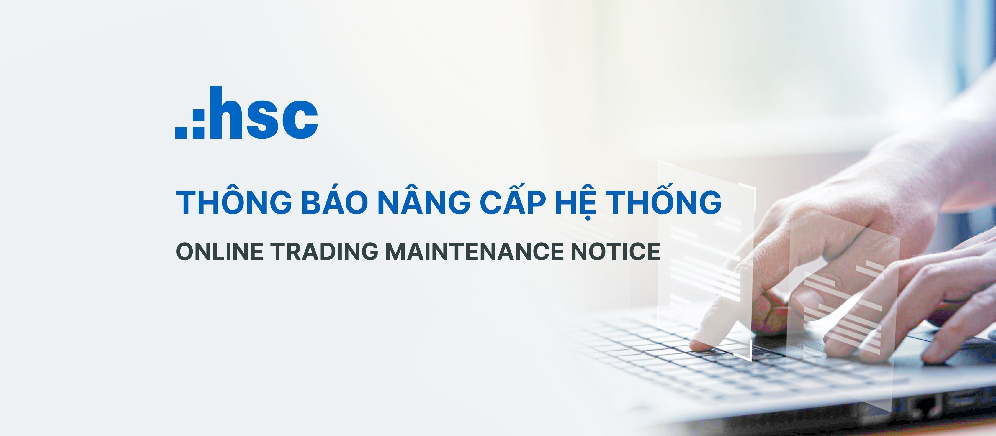 Kính gửi Quý khách hàng, HSC xin thông báo tiến hành nâng cấp hệ thống từ 06:00 PM to 08:00 PM ngày 29/10/2025 . Trong thời gian nâng cấp, các dịch vụ sau đây sẽ bị ảnh hưởng: HSC ONE (web & mobile) eKYC Sau thời gian trên, các dịch vụ sẽ hoạt động trở lại bình thường. Rất mong Quý khách hàng thông cảm vì sự bất tiện này. Trân trọng, HSC